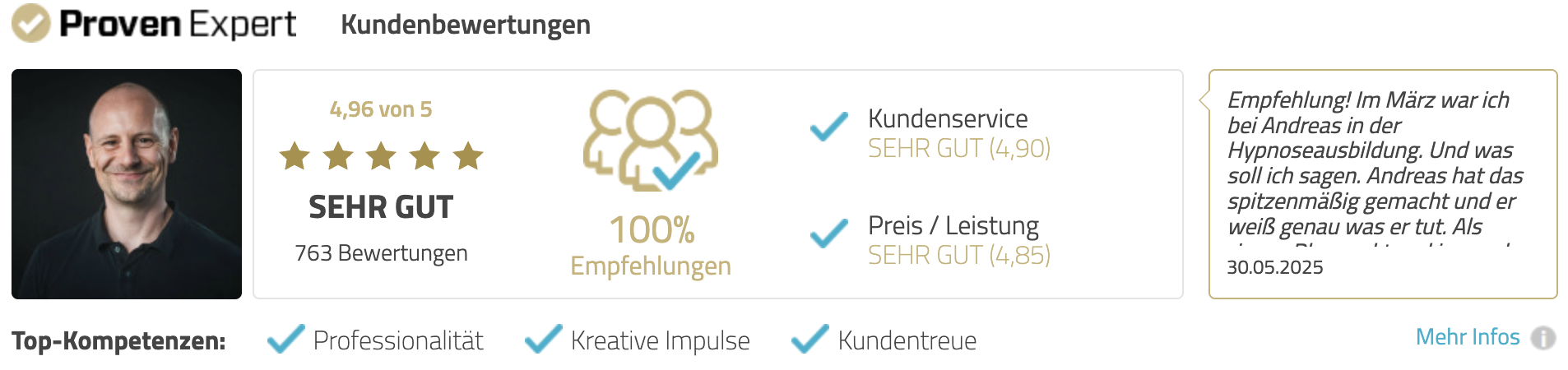 💬Absolut empfehlenswert. Andreas hat eine wundervolle Gabe, die Hypnose beizubringen und vorzuführen.